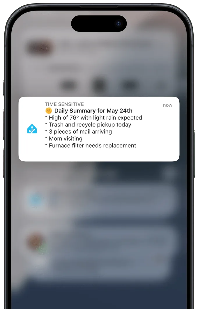 Non-critical messages like filter replacements or trash reminders are bundled into a daily evening digest, reducing interruption while maintaining awareness.